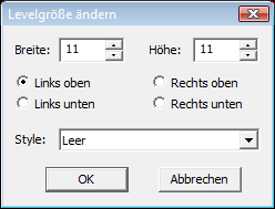Levelgröße Ändern: Damit kann man den Level vergrößern oder verkleinern. Es öffnet sich ein Dialog, in dem man die neue Größe angeben kann, sowie auch in welche Richtung die Größenänderung stattfinden soll und wie der neue Bereich vorbelegt sein soll.